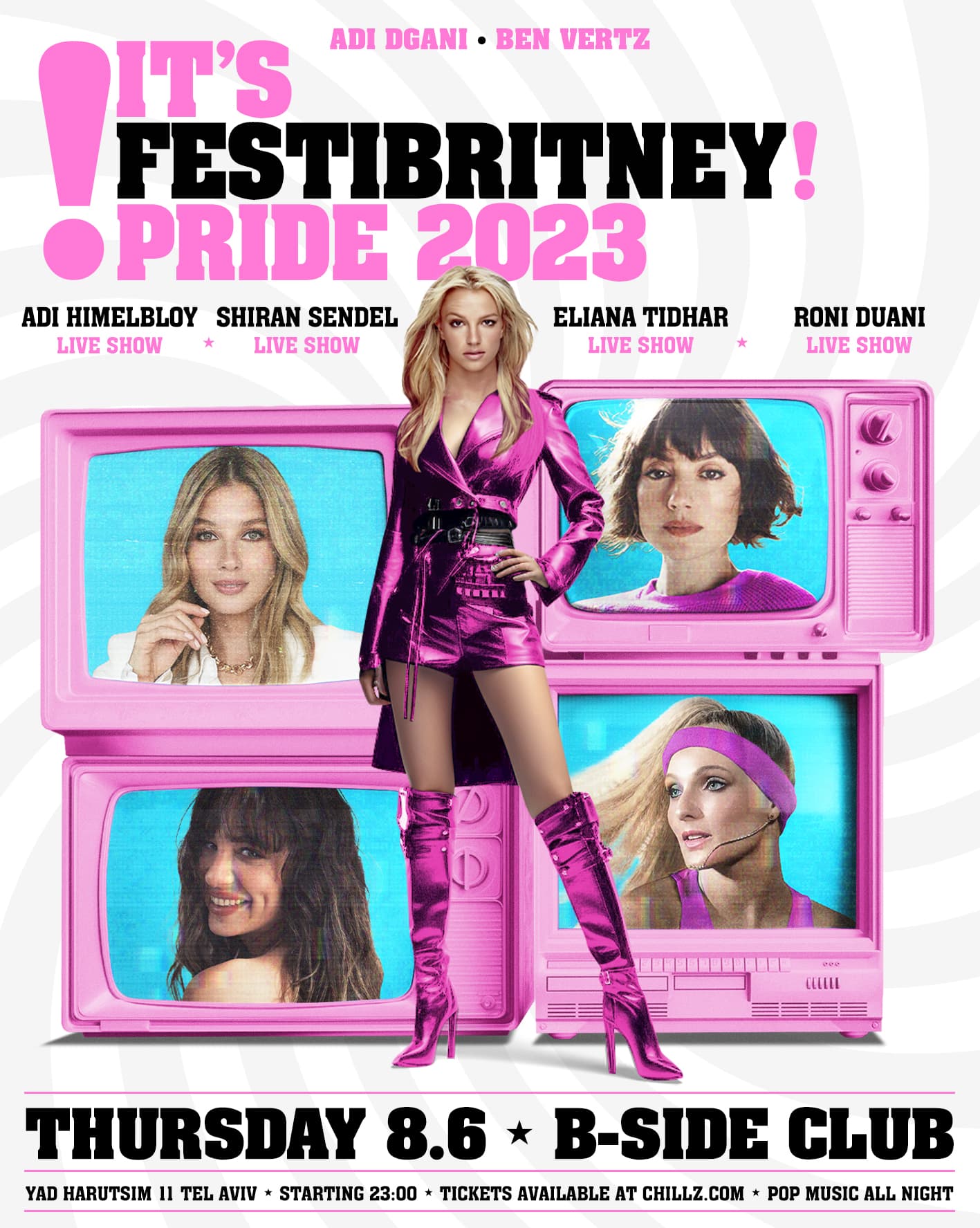 On Thursday 8.6 After the parade at B Side club in the biggest Britney party EVER with the biggest stars of Israel’s Pestigal (a famous kids music show) of all times with live shows on stage with thier most loved hits.